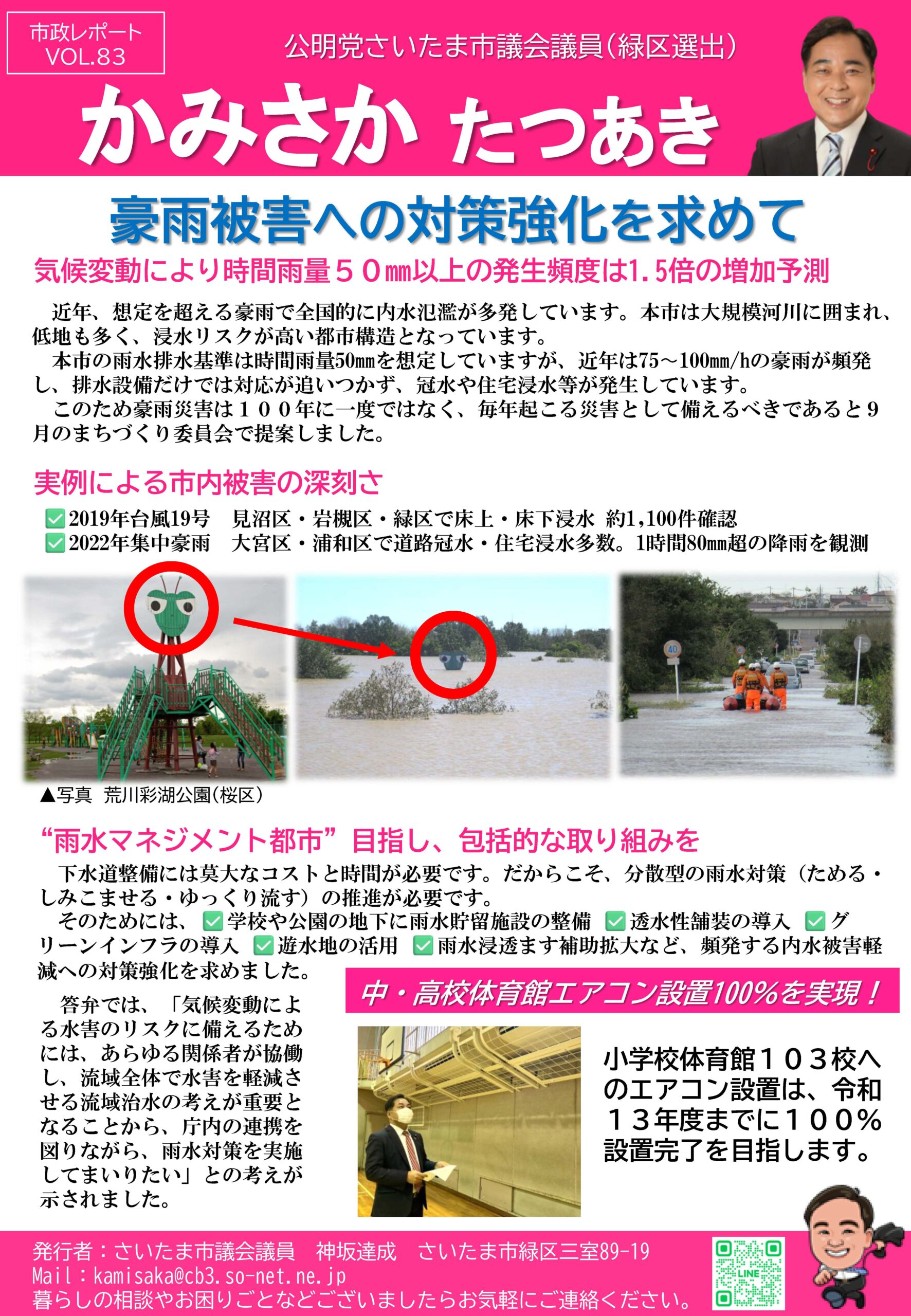 このため豪雨災害は100年に一度ではなく、毎年起こる災害として備えるべきであると9月のまちづくり委員会で提案しました。